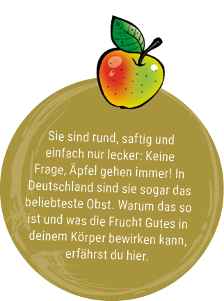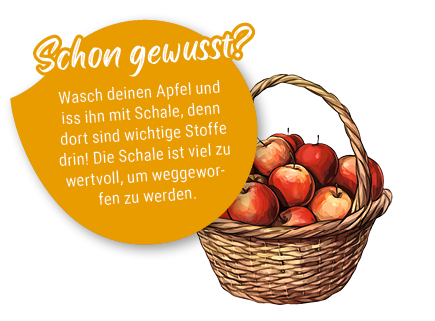 Kennst du dieses englische Sprichwort? An apple a day keeps the doctor away. Auf Deutsch heißt das: Ein Apfel am Tag hält den Arzt fern. Das stimmt natürlich nicht ganz, denn du kannst dich immer noch erkälten, obwohl du einen Apfel gegessen hast. Trotzdem hat dieses Obst viele gute Eigenschaften, über die sich dein Körper freut. Es kann zum Beispiel dein Immunsystem stärken, damit du seltener krank wirst. Wie Äpfel das machen? In ihnen ist ein besonderer Stoff namens Vitamin C. Und wusstest du, dass vor allem die Apfelschale gegen Durchfall hilft?