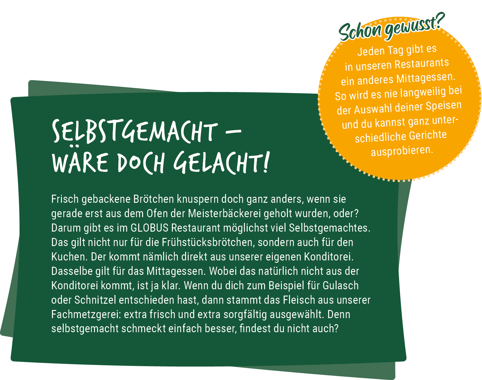 Sushi ist bei GLOBUS etwas ganz Besonderes. In vielen Markthallen findest du deshalb eine eigene Sushibar. Dort gilt das Motto: „Von Hand mit Herz. GLOBUS.“ Und das spürt man bei jedem Bissen. Das Fachpersonal bereitet das Sushi frisch zu, mit viel Liebe und besten Zutaten. Ob für den kleinen Snack oder den großen Hunger: Die verschiedenen Portionsgrößen passen immer. Manchmal gibt es sogar Überraschungen! Neben Fisch und Gemüse verwenden manche Markthallen auch Obst. So wird Sushi zu einer süßen Leckerei.