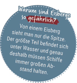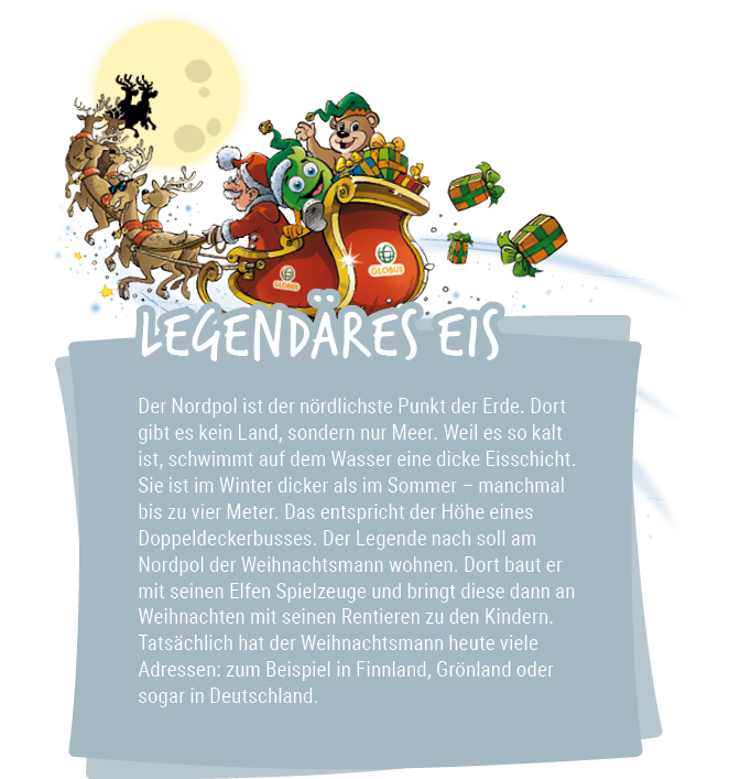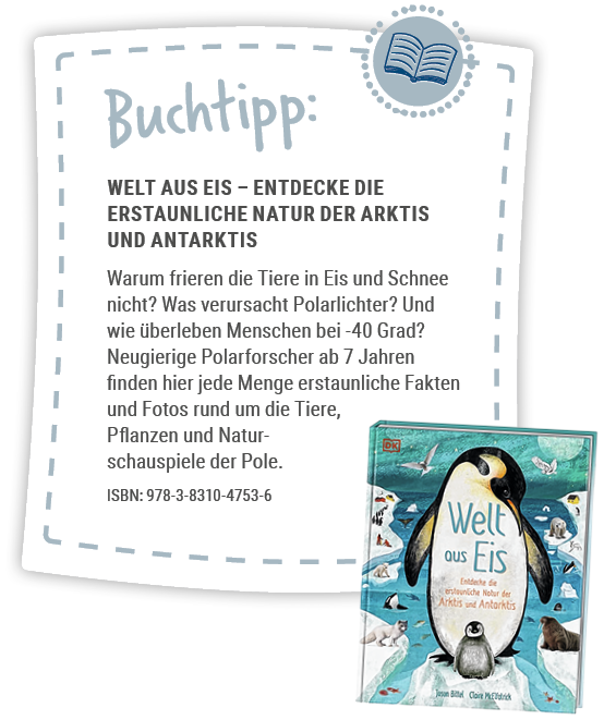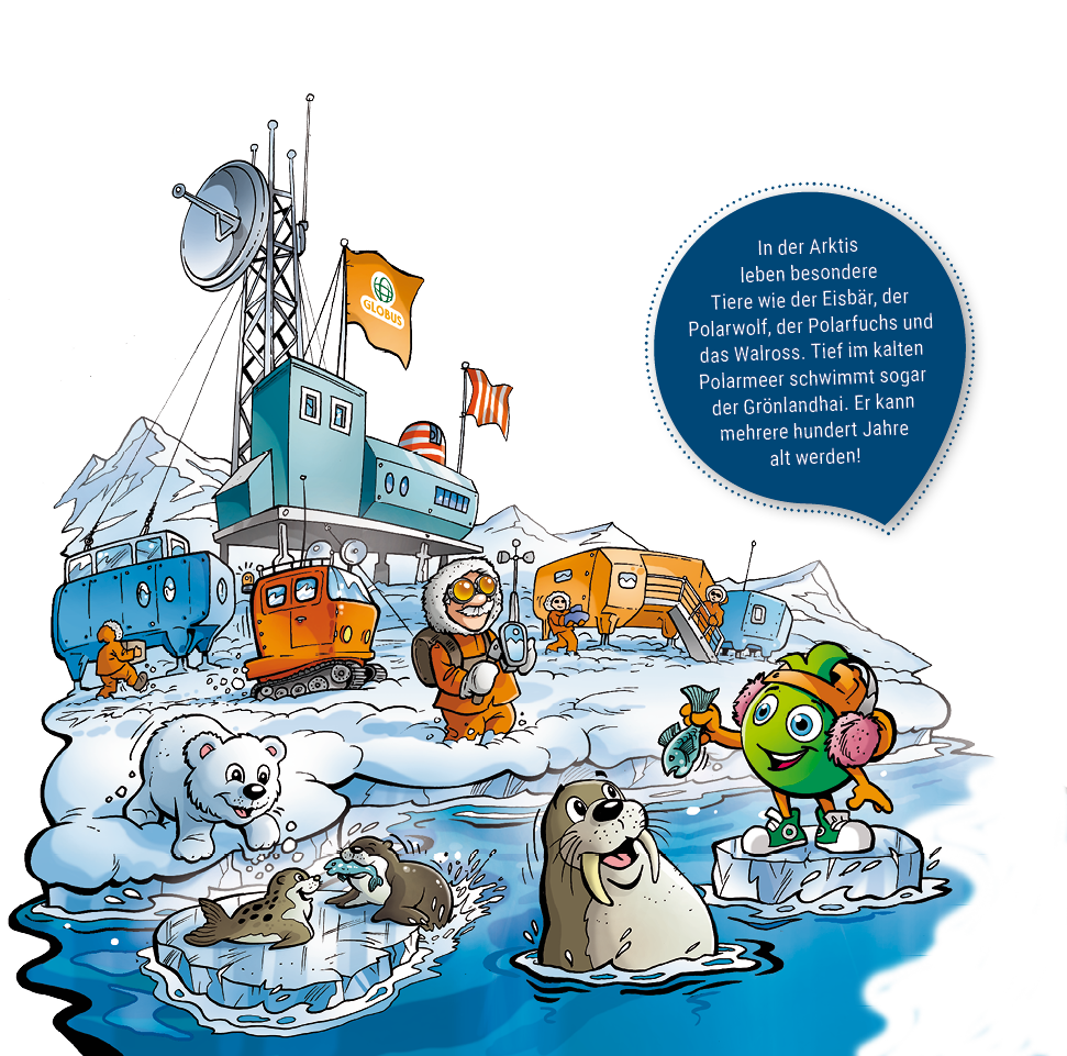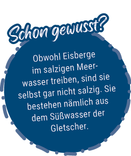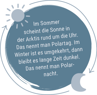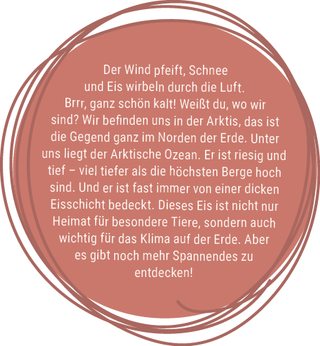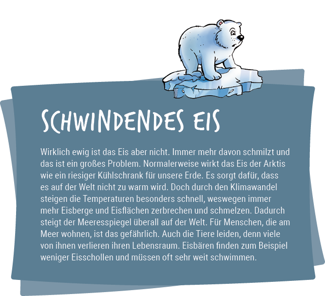 Die Arktis wird oft ewiges Eis genannt, weil sie fast immer von einer dicken Schicht aus Schnee und gefrorenem Wasser bedeckt ist. Im Winter kann es dort bis zu minus 40 Grad Celsius kalt werden, das ist doppelt so kalt wie ein Gefrierschrank! Im Sommer schmilzt ein Teil, aber in der Mitte bleibt eine große Fläche gefroren. Rundherum gibt es sogenanntes Packeis, das sind dicke Schollen, die am Meeresboden oder an den Küsten festfrieren. Auf dem Meer schwimmen Eisberge. Wo die wohl herkommen? Sie brechen von Gletschern ab und treiben dann durchs Wasser.