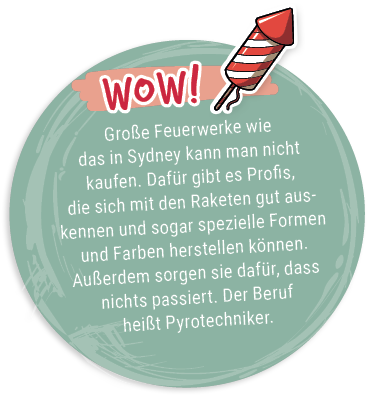 In Sydney, der größten Stadt Australiens, gibt es am Silvesterabend viel zu staunen. Das Feuerwerk ist eines der größten auf der Welt. Hast du das Gebäude mit den großen weißen Zacken auf der Titelseite des Entdecker-Magazins gesehen? Das ist das Opernhaus von Sydney. Es wird passend zum Feuerwerk hübsch beleuchtet und ist ein beliebtes Motiv zum Fotografieren. Besonders ist, dass die Australier mit ihrem Feuerwerk nicht bis Mitternacht warten. Schon am Abend gibt es eine Show für Familien, die nicht ganz so lange wach bleiben möchten.