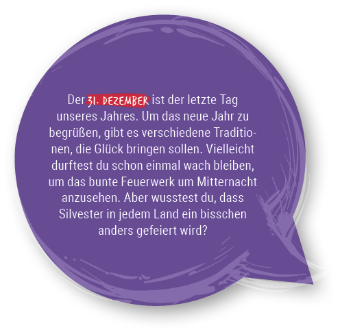 Freunde und Familie kommen zu Besuch. Zu essen gibt es in Deutschland oft Fondue, das ist ein Topf mit heißer Brühe oder heißem Fett. Alle Gäste bekommen einen Spieß, mit dem sie ein Stück Fleisch hineintunken können, bis es durchgegart ist. Kurz vor Mitternacht ist es dann so weit. Gemeinsam wird heruntergezählt, bis die Uhr 00:00 zeigt. Bunte Raketen knallen zum Himmel hinauf und glitzern am Sternenhimmel um die Wette. Jetzt wünscht man sich gegenseitig ein frohes neues Jahr. Manchmal werden auch kleine Schweinchen oder Schornsteinfeger aus Marzipan verschenkt. Sie sollen Glücksbringer sein.